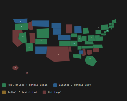 The legal landscape falls into four categories: states with full online and retail betting, states with limited or retail-only markets, states with tribal-only options, and states where it remains illegal entirely.